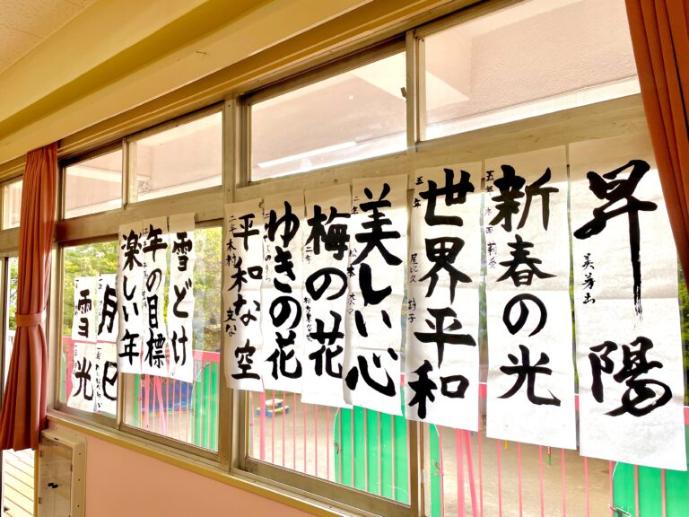 2年生からは、書き初め用紙で作品を作るのですが、各々、いつもと違う文字の配置、紙の配分を一生懸命考えながら書いておりました。見ていると手を貸してあげたくなってしまうのですが、後ろに手を組んで我慢です。